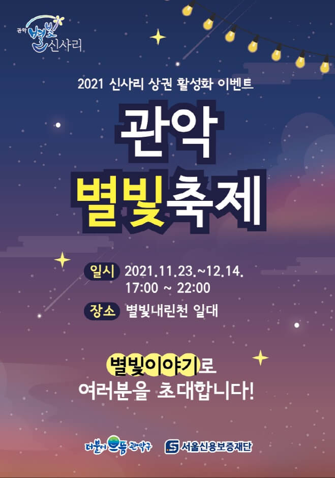 관악 별빛축제는 신원시장, 관악 종합시장, 서원동에서 별빛축제를 보실 수 있습니다. 코로나19로 인해 힘들었던 2021년을 힐링하자는 의미로 불꽃 조명축제를 하며 관악 별빛축제 조명축제는 별빛 내린천으로 마실 내려온 토끼와 사랑과 축복의 루미나라에가 펼쳐지고 강감찬 장군이 탄생할 때 떨어진 별빛도 이곳 별빛 내린천에 깃들여 있는 의미가 있습니다.