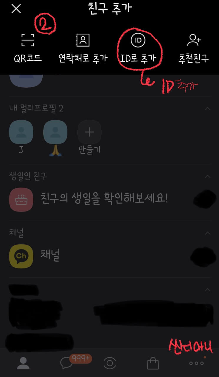 • 사람 아이콘을 누른 후에 아이디로 추가를 눌러줍니다.