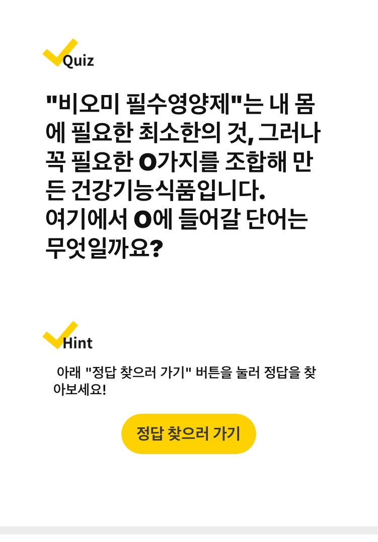 Q. 비오미 필수영양제는 내몸에 필요한 최소한의 것 그러나 꼭 필요한 O가지를 조합해 만는 건강기능 식품입니다