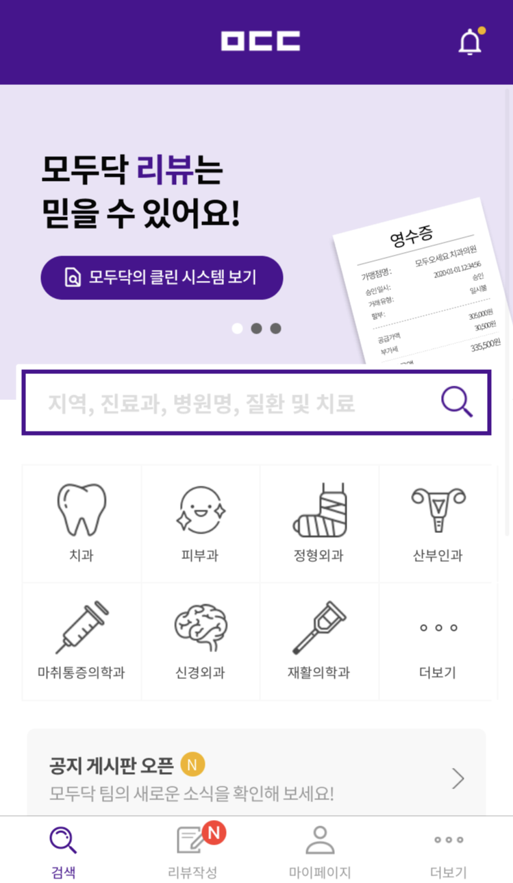 #모두닥 어플을 로그인하면 검색을 통해서 리뷰를 볼 수 있다.