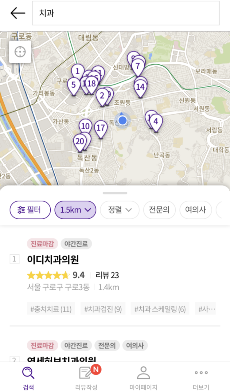 예시로 치과를 검색하게 되면 집에서 가장 가까운 순으로 치과들이 쭉 뜬다.