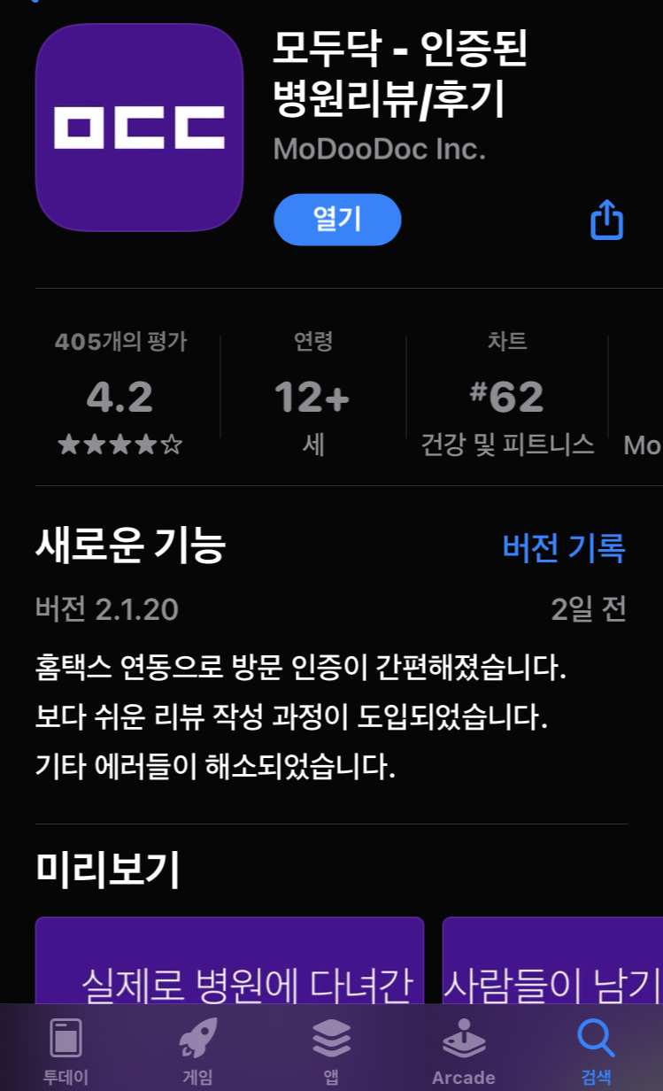 어플을 찾았다. '모두닥'앱은 실제로 병원에 다녀간 환자들의 리뷰를 담아 놓았다. 실제로 내가 다녀온 병원의 영수증만 있으면 나도 그 병원에 대한 리뷰를 남길 수 있다. 그리고 포인트를 얻을 수 있는데 그 포인트를 통해 기프트콘을 구입할 수 있다.