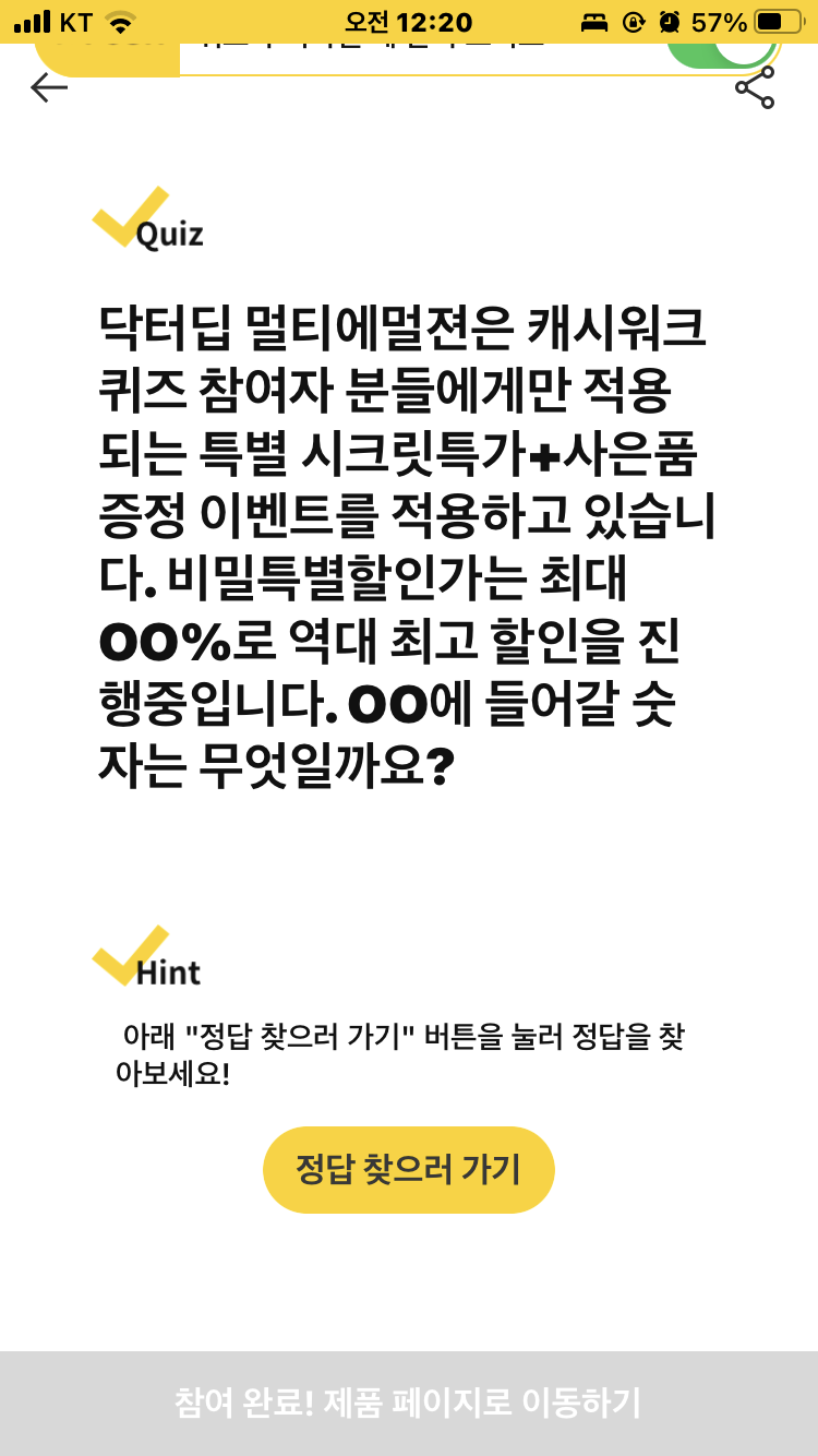 닥터딥 멀티에멀젼은 캐시워크 퀴즈 참여자 분들에게만 적용되는 특별 시크릿특가+ 사은품 증정 이벤트를 적용하고 있습니다. 비밀특별할인가는 최대 ㅇㅇ% 역대 최고 할인을 진행중입니다. ㅇㅇ에 들어갈 숫자는?