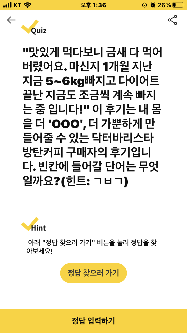 맛있게 먹다보니 금새 다 먹어 버렸어요 마신지 1개월 지난 지금 5~6kg 빠지고 다이어트 끝난 지금도 조금씩 계속 빠지는 중입니다. 이 후기는 내 몸을 더 ㅇㅇㅇ 더 가뿐하게 만들어줄 수 있는 닥터바리스타 방탄커피 구매자의 후기입니다. 빈칸에 들어갈 단어는 무엇일까요?