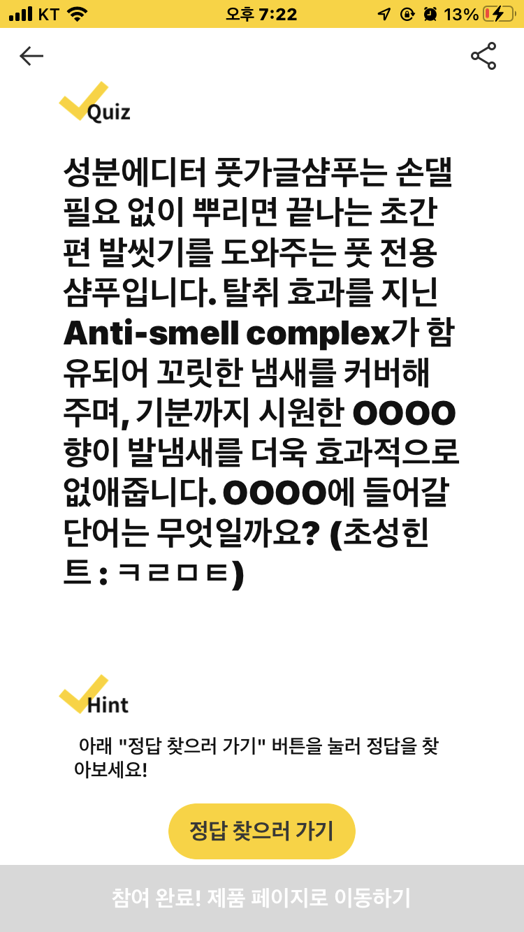 성분에디터 풋가글샴푸는 손댈 필요 없이 뿌리면 끝나는 초간편 발씻기를 도와주는 풋 전용 샴푸입니다. 탈취 효과를 지닌 anti-smell complex가 함유되어 꼬릿한 냄새를 커버해주며 기분까지 시원한 ㅇㅇㅇㅇ향이 발냄새를 더욱 효과적으로 없애줍니다 ㅇㅇㅇㅇ에 들어갈 단어는 무엇일까요? ㅋㄹㅁㅌ