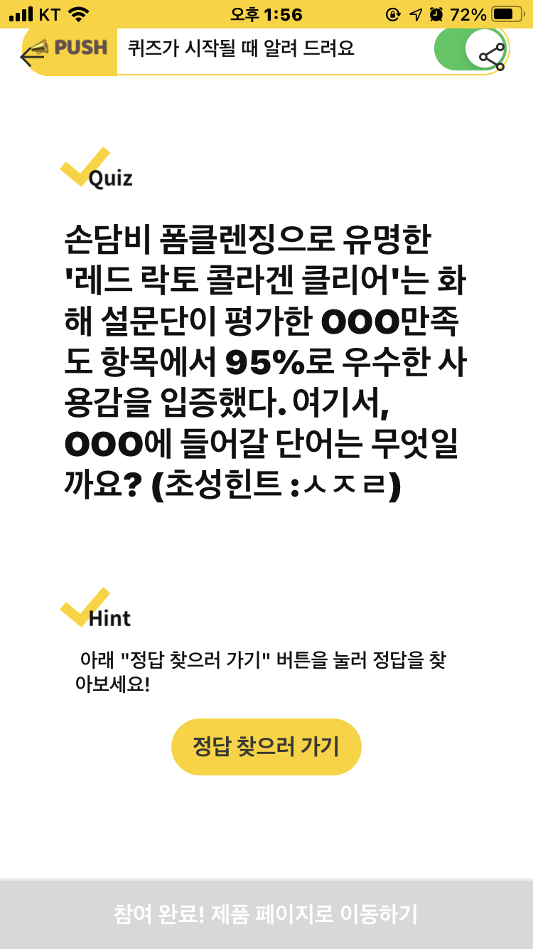 Q.손담비 폼클렌징으로 유명한 '레드 락토 콜라겐 클리어'는 화해 설문단이 평가한 000 만족도 항목에서 95%로 우수한 사용감을 입증했다. 여기서, 000에 들어 갈 단어는 무엇일까요?