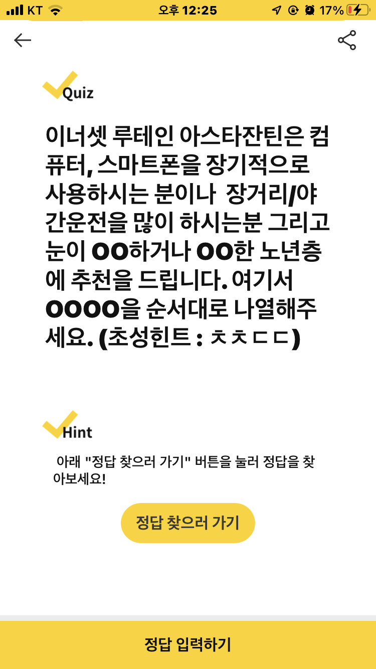 이너셋 루테인 아스타잔틴은 컴퓨터,스마트폰을 장기적으로 사용하시는 분이나 장거리/야간운전을 많이 하시는분 그리고 눈이 ㅇㅇ하거나 ㅇㅇ한 노년층에 추천을 드립니다. 여기서 ㅇㅇㅇㅇ을 순서대로 나열해주세요 ㅊㅊㄷㄷ