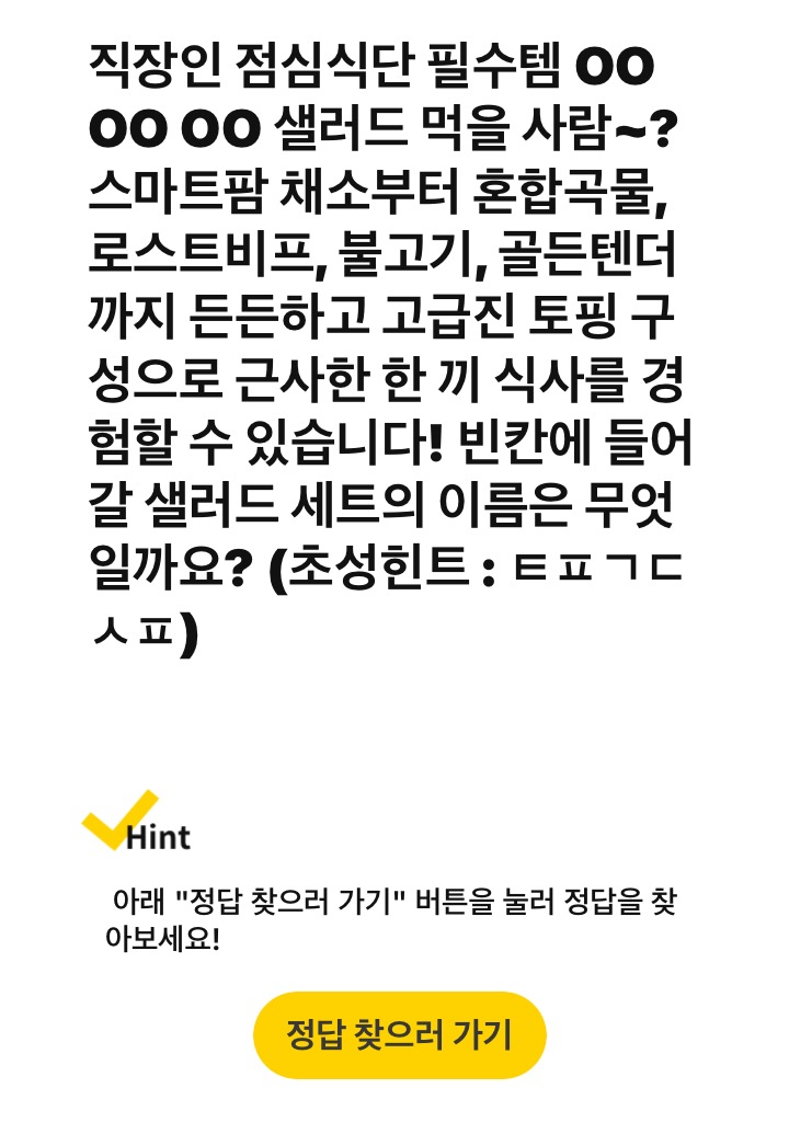 Q. 직장인 점심식단 필수템 OO OO OO 샐러드 먹을 사람~?