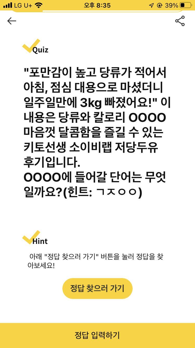 포만감이 높고 당류가 적어서 아침, 점심 대용으로 마셨더니 일주일 만에 3kg 빠졌어요 이 내용은 당류와 칼로리 ㅇㅇㅇㅇ 마음껏 달콤함을 즐길 수 있는 키토선생 소이비랩 저당두유후기입니다 ㅇㅇㅇㅇ에 들어갈 단어? ㄱㅈㅇㅇ