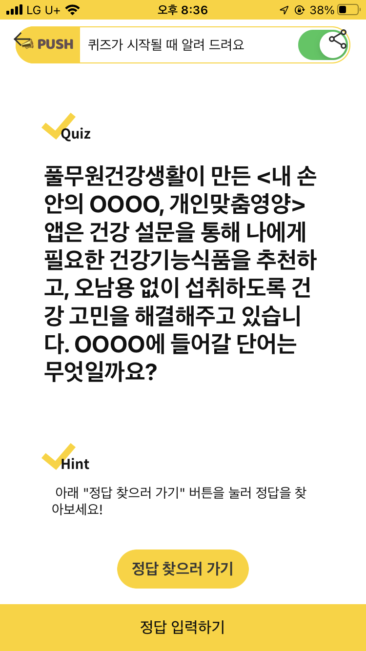 풀무원건강생활이 만든 내 손안의 ㅇㅇㅇㅇ 개인맞춤영양 앱은 건강 설문을 통해 나에게 필요한 건강기능식품을 추천하고 오남용 없이 섭취하도록 건강 고민을 해결해주고 있습니다 ㅇㅇㅇㅇ에 들어갈 단어는?