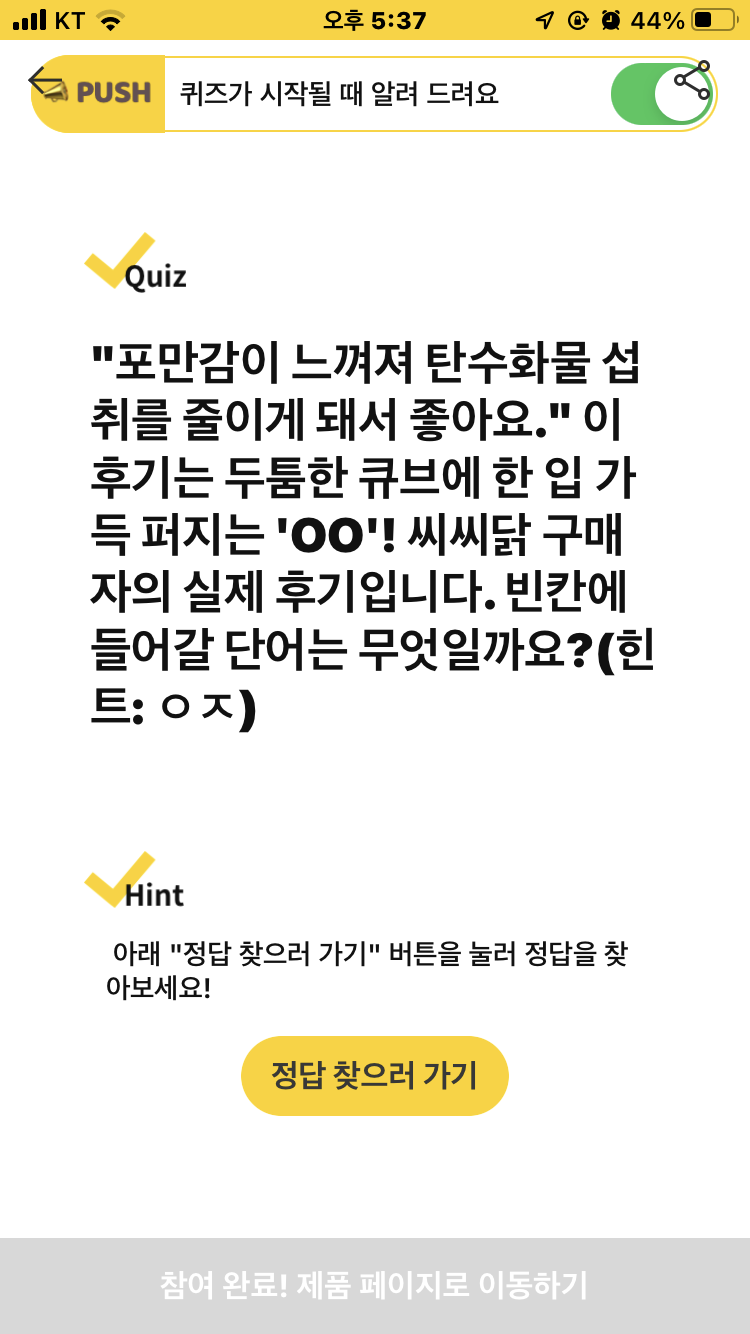포만감이 느껴져 탄수화물 섭취를 줄이기 돼서 좋아요 이 후기는 두툼한 큐브에 한 입 가득 퍼지는 ㅇㅇ! 씨씨닭 구매자의 실제 후기입니다. 빈칸에 들어갈 단어는 무엇일까요? ㅇㅈ