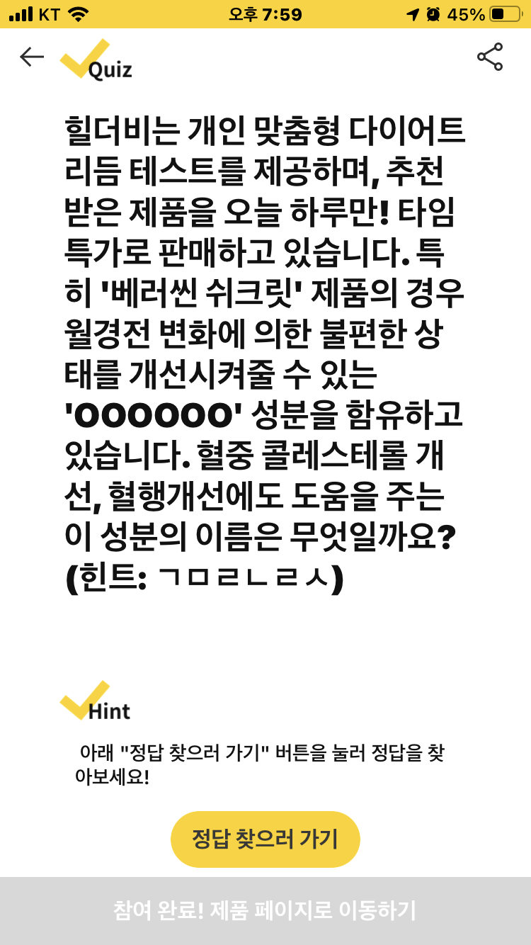 Q 힐더비는 개인 맞춤형 다이어트 리듬 테스트를 제공하며 추천받은 제품을 오늘 하루만