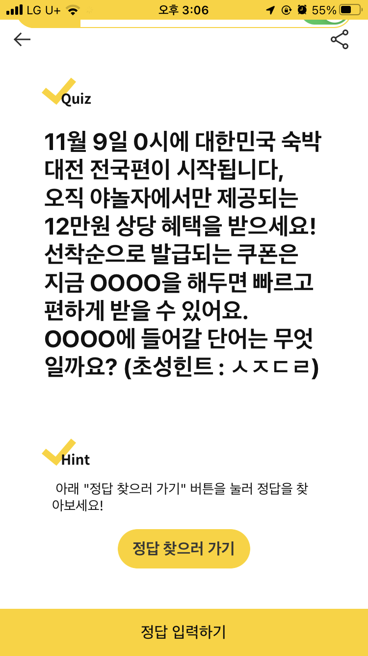 11월 9일 0시에 대한민국 숙박 대전 전국편이 시작됩니다. 오직 야놀자에서만 제공되는 12만원 상당 혜택을 받으세요