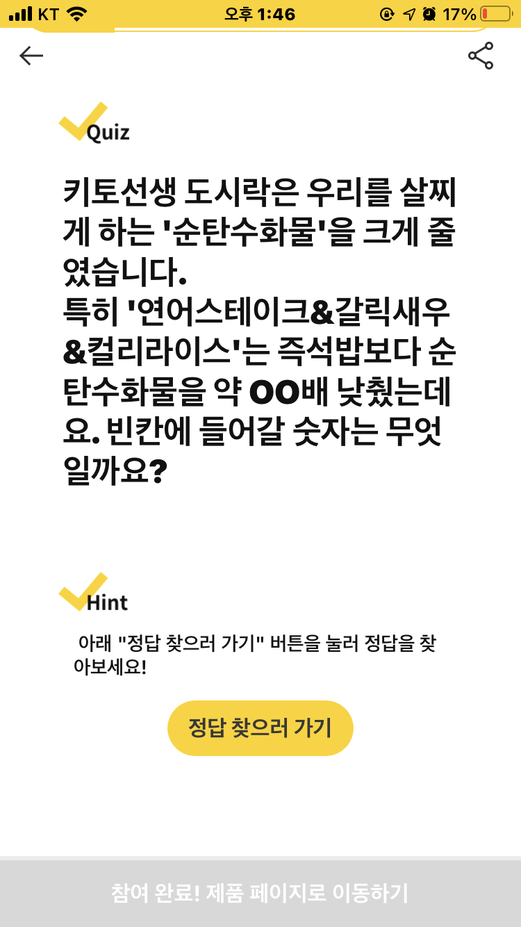 Q.키토선생 도시락은 우리를 살찌게하는 순탄수화물을 크게줄였습니다 특히 연어스테이크&갈릭새우&컬리라이스는 즉석밥보다 순탄수화물을 약 ㅇㅇ배 낮췄는데요 빈칸에 들어갈 숫자는 무엇일까요?