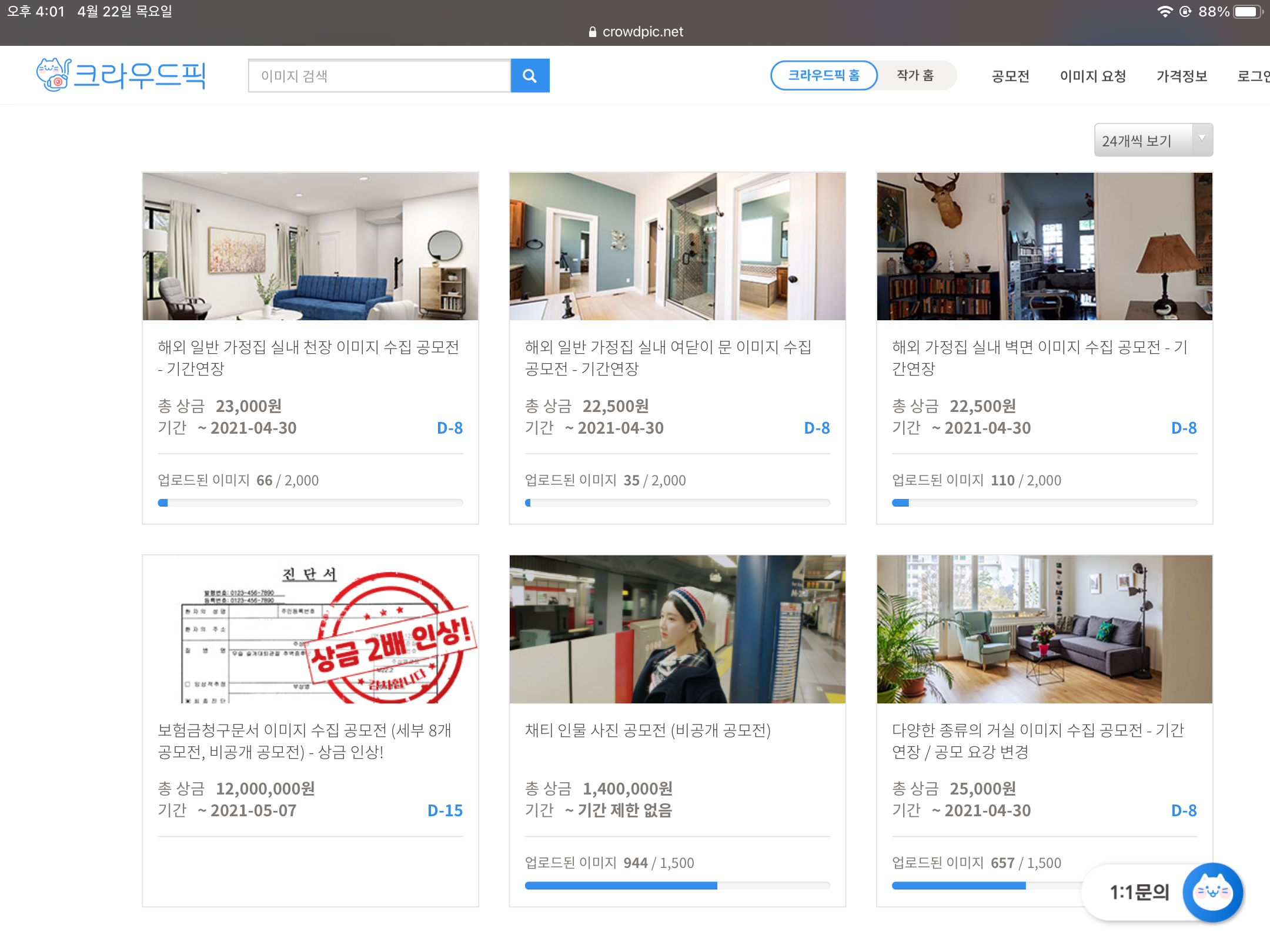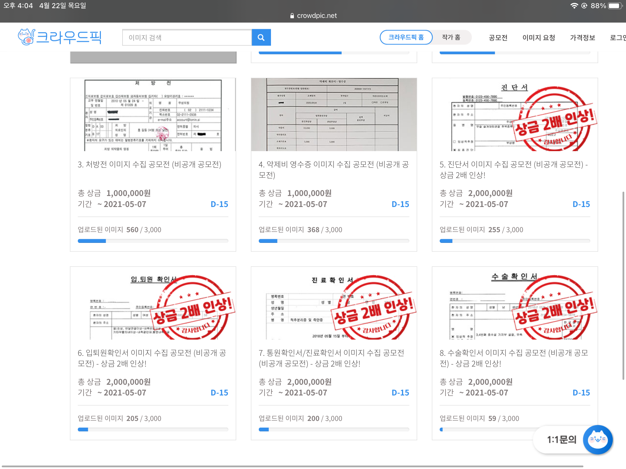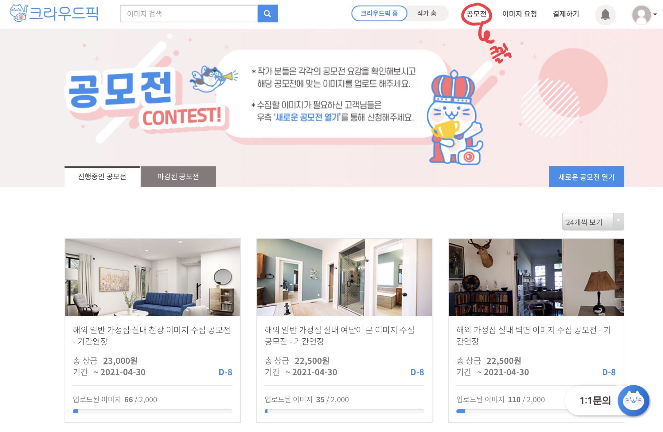현재 진행중인 공모전들 입니다 수집 중인 이미지를 찾아서 이미지를 업로드 해주면 돈이 들어오게 되는데요