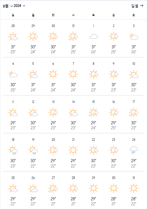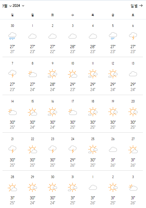 1. 기온: 낮 기온은 27도에서 32도 사이, 밤 기온은 23도에서 27도 사이로, 매우 덥습니다. 열대야 현상이 나타날 수 있습니다.