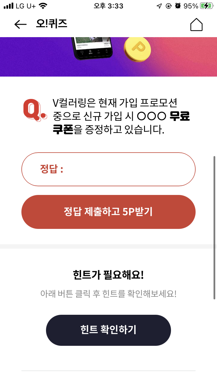 3시 오퀴즈 정답 v 컬러링은 현재 가입 프로모션 중으로 신규 가입 시 ㅇㅇㅇ무료 쿠폰을 증정하고 있습니다